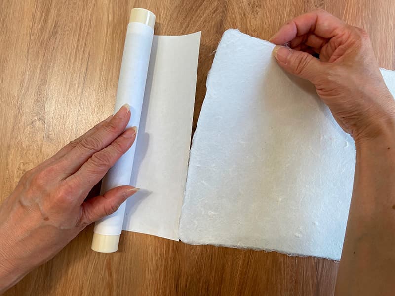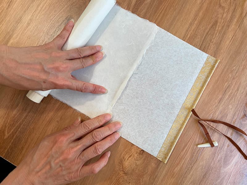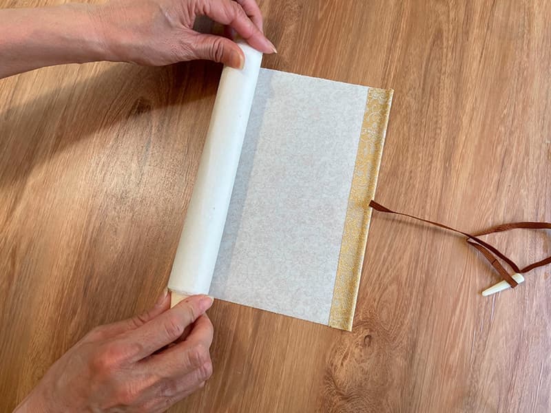 サイズ約190mm×370mmの和紙を作成し、湿った状態で干し板に張って持ち帰ります。乾いたら「巻物セット」に貼り付けて完成です。